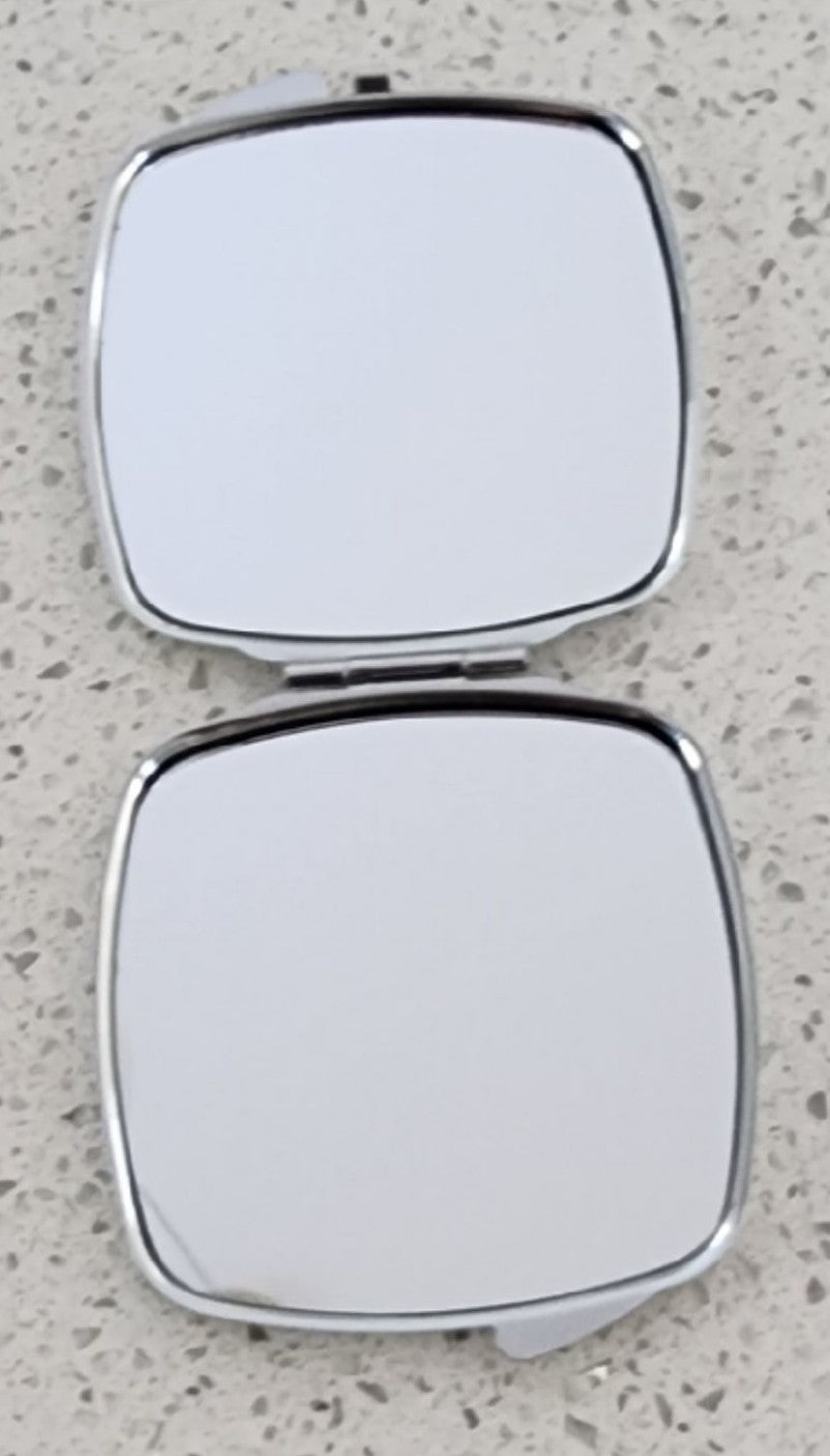 Rectangular compact mirror made of a durable metal and includes a regular and a 3x's magnification mirror, 3" x 3". Perfect for your purse, travel bag, or pocket.