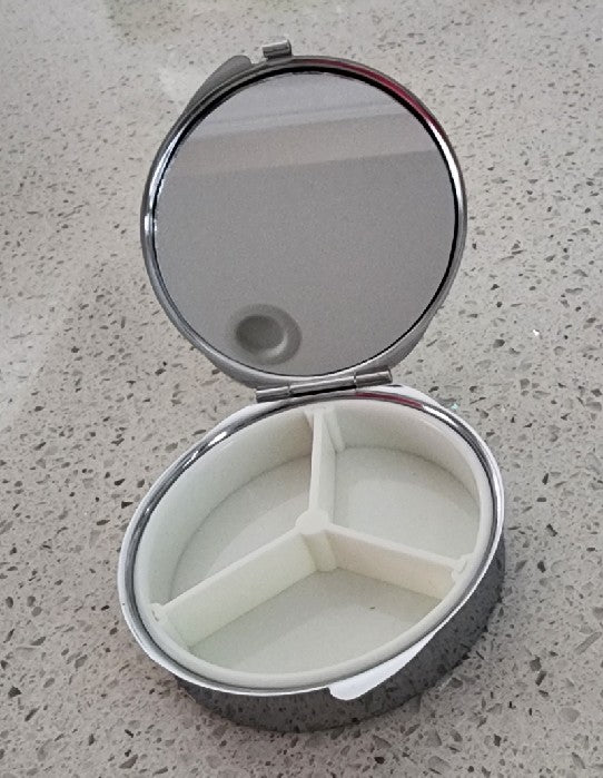 Round pill box made of a durable metal and includes a compact mirror and three pill compartments, 2" x 2" x 6.2".