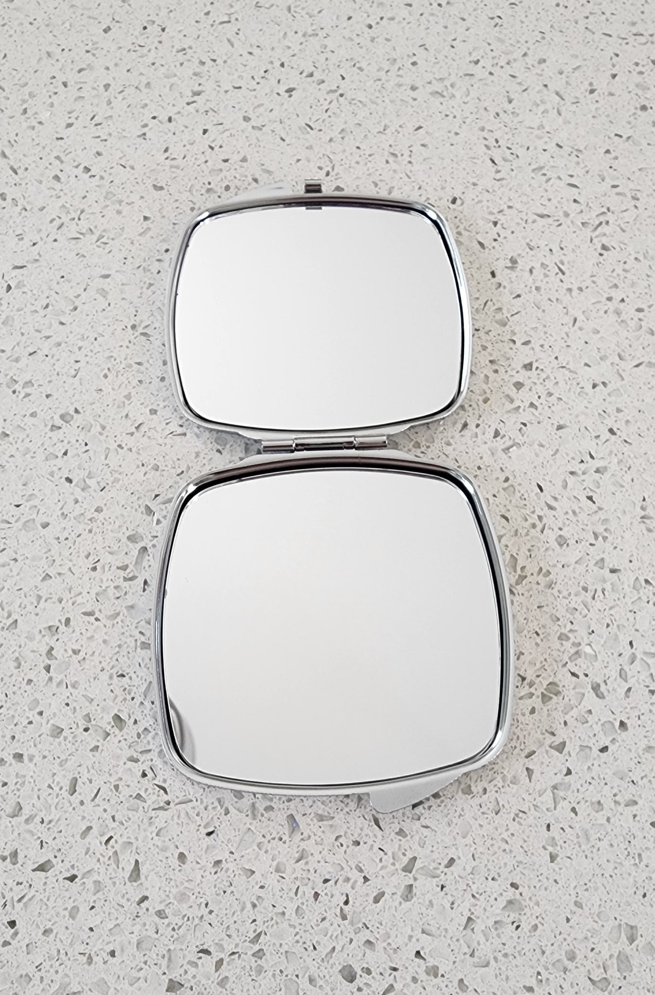Square compact mirror made of a durable metal with rounded edges and includes a regular and a 3 x's magnification mirror, approx. 2-3/4".