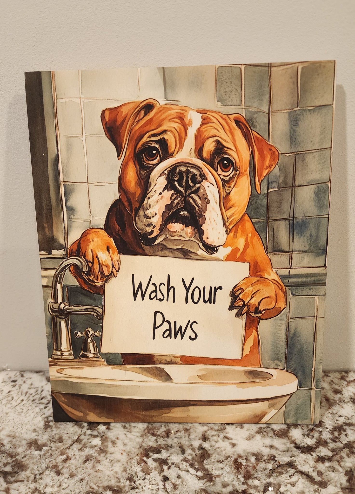 English Bulldog - "Wash Your Paws" Sold Birch Wood Wall Art