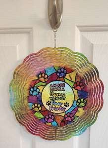 Our wind spinners are 10" in diameter, double-sided, and made from indoor/ outdoor stainless steel, and include a hook for hanging.